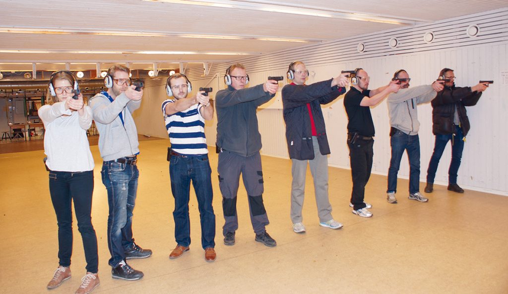 I Svenska Ju-jutsuförbundets graderingssystem finns ett antal försvar mot skjutvapen (pistol, revolver). Jag har fått förfrågan från flera instruktörer om att få mer kunskap om hur skjutvapen fungerar och hur det känns att skjuta med pistol. Det har jag tagit fasta på och den första kursen hölls den 5/3 2016.