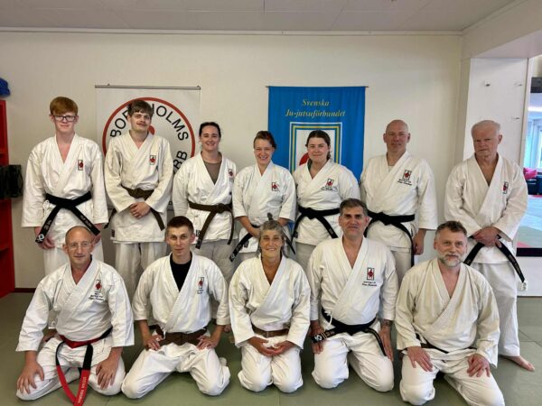 Godkända Steg 2 instruktörer under ledning av riksinstruktör Stefan Forsman 6 dan. Stående: Filip Oldin Kalmar BK, Isac Taylor Linköpings BK, Linnea Schildt Malmö JJK,…